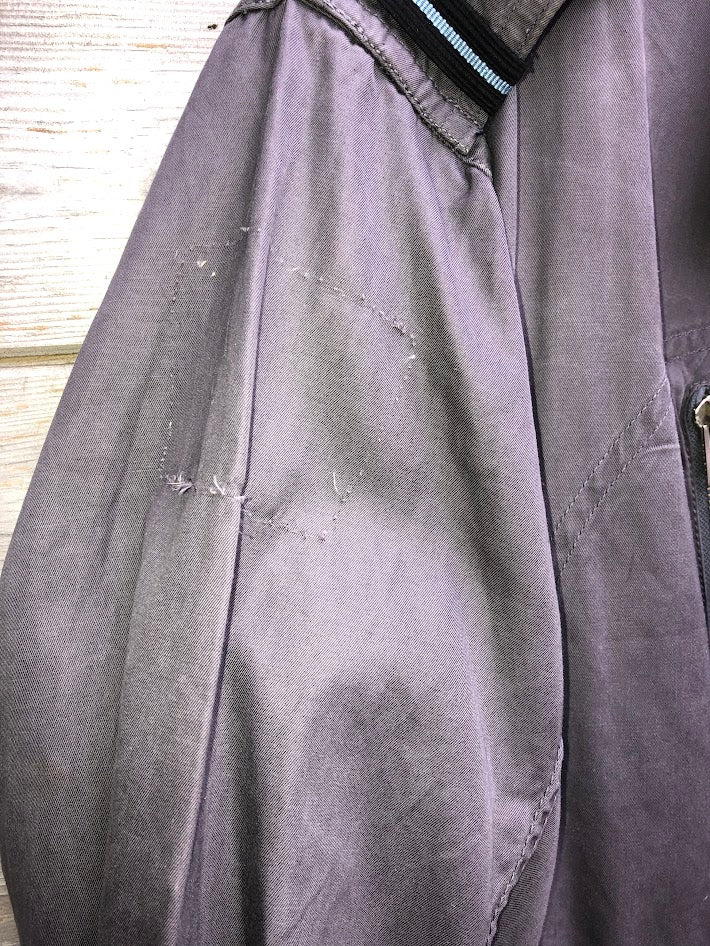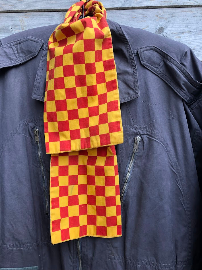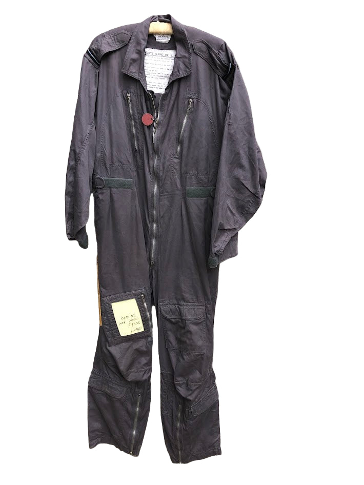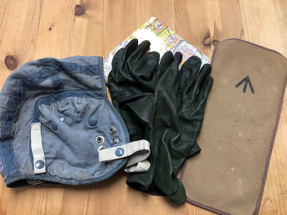 A NAMED FLYING SUIT IN GOOD ORDER , SHOWS STITCHING WERE BREVET AND PATCH HAVE BEEN REMOVED, WITH SQUADRON SCARF GLOVES, HELMET AND NAV ITEM.